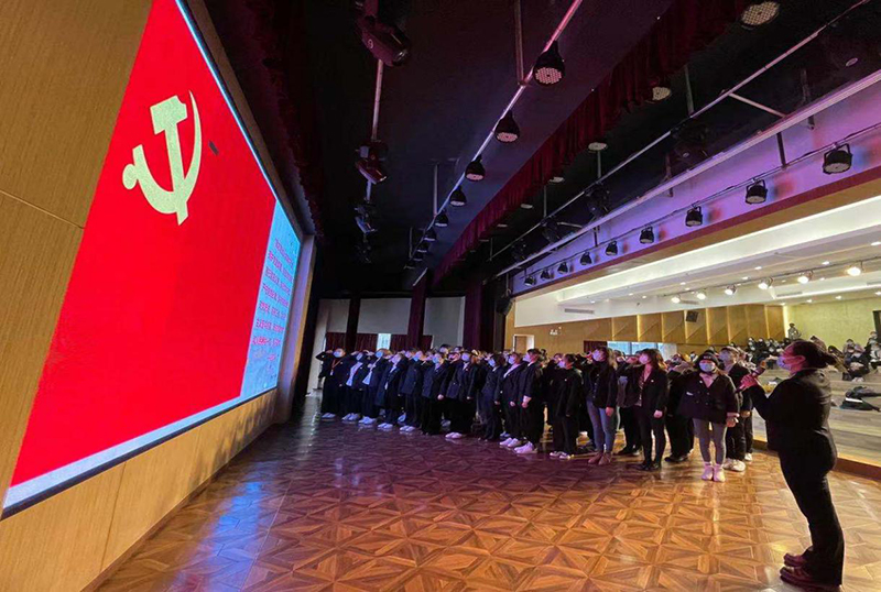 学习后,全体党员重温党的誓词。在奏唱《国际歌》 后,全体师生党员(含新入党)党员在郑玉笛副书记的领誓下,面对党旗对党庄严宣誓;党员代表面对党旗发言表达决心。